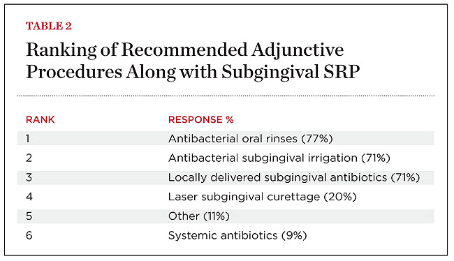 Answers concerning adjunctive procedures recommended along with subgingival SRP showed that anti-infective agents in several forms are being used concurrently with SRP (Table 2). Because periodontal diseases are initiated by oral pathogens—and some of the pathogens are tissue invasive—concurrent use of anti-infective agents has become a common protocol in clinical practice.4,10