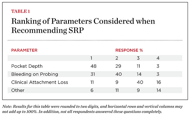 With regard to diagnostics, respondents reported that they use pocket depth and bleeding on probing as the basis of their decision on when to initiate scaling and root planing (SRP) (Table 1). Some of the most revealing information obtained, however, came from the write-in option “Other.” There, among 17 individual reasons given for the decision to initiate SRP were radiographic bone loss, oral hygiene status, home care status, presence of subgingival calculus, and others, demonstrating that clinicians are using critical thinking and a sophisticated thought pattern, rather than a one-size fits all approach. No respondents mentioned plaque sampling or other diagnostic tests.7 Diagnostic tests, such as the use of microbiologic culture and sensitivity tests along with evaluation of patients’ gingival crevicular fluid and saliva, have been studied and may one day be commonly used by clinicians.8,9