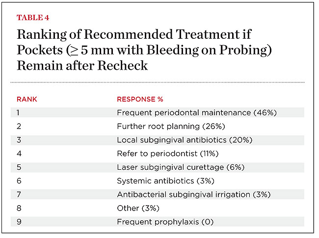 Forty-six percent of respondents indicated that they would place patients with unresolved deep pocketing (5 mm or greater) and areas of active inflammation after initial SRP on frequent maintenance; and 20% would use subgingival antibiotics (Table 4). If calculus is still present on the root surface, further root planing can be helpful, but periodontal maintenance or further subgingival antibiotic placement alone is unlikely to resolve this problem. Lang and associates have shown that pockets 5 mm or less that do not bleed on probing tend to be stable with regard to bone loss.21 Interestingly, only 11% of respondents would refer their patients to a periodontist if initial therapy did not produce a clinically stable situation. This may mean that clinicians are comfortable trying further root planing or frequent periodontal maintenance prior to referring to a periodontist. However, if active disease remains, placing a patient in a long-term “holding pattern” has the potential to endanger their periodontal health. After referral, periodontists can provide advanced nonsurgical instrumentation techniques and/or surgical therapy if indicated. Surgical therapy can provide visual access for root instrumentation, reduce pocket depths, regenerate lost periodontium, and is supported by evidence-based research.22-24