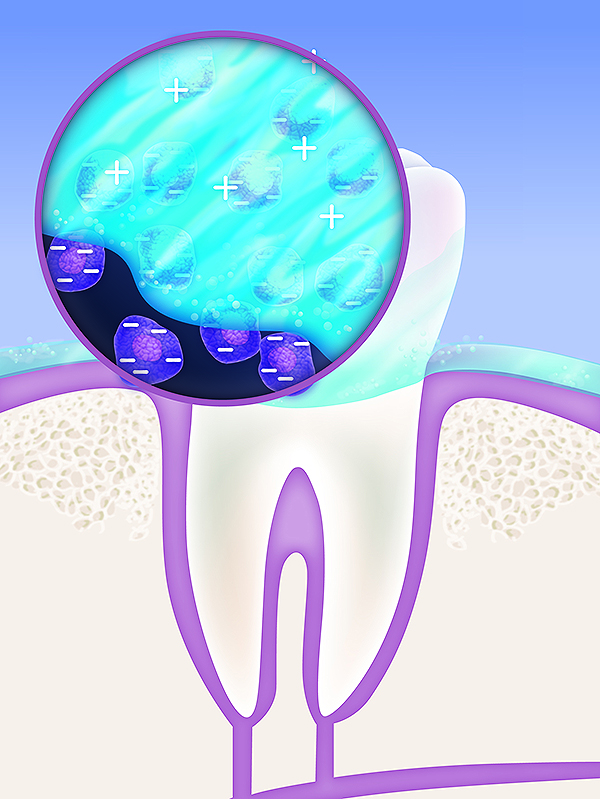 Fig 4 The positively charged cetyl pyridinium chloride (CPC) binds to the bacterial surface (Fig 4) to cause disruption of bacterial cell membrane function (Fig 5), leakage of cytoplasmic material (Fig 6), and bacterial cell death (Fig 7). (Images courtesy of Procter & Gamble. Reprinted from the Journal of Contemporary Dental Practice, 2005;6(1), with permission.)