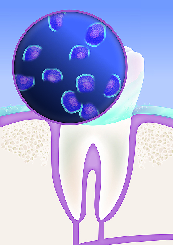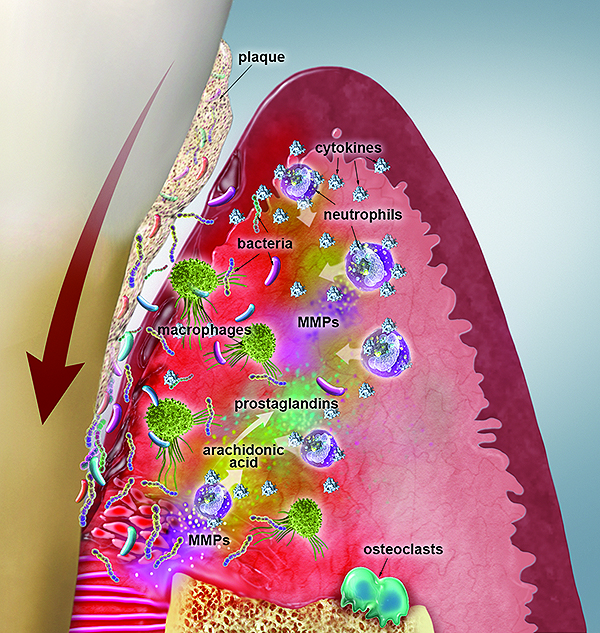 In the healthy periodontium, the innate response attempts to eliminate foreign bodies and is protective against injury or infection.36 Periodontal disease results from the body’s failure to turn off its inflammatory response to infection. The result is chronic maladaptive inflammation.37 This produces an environment that exudes a rich source of nutrients such as degraded host proteins, which are specifically what pathogenic bacteria need for survival and growth. Bacterial pathogens continue to exploit this environmental change, leading to more bacteria, more inflammation, bone resorption, and a perfect niche space (deeper periodontal pockets) where the entire process can continue undisturbed.38