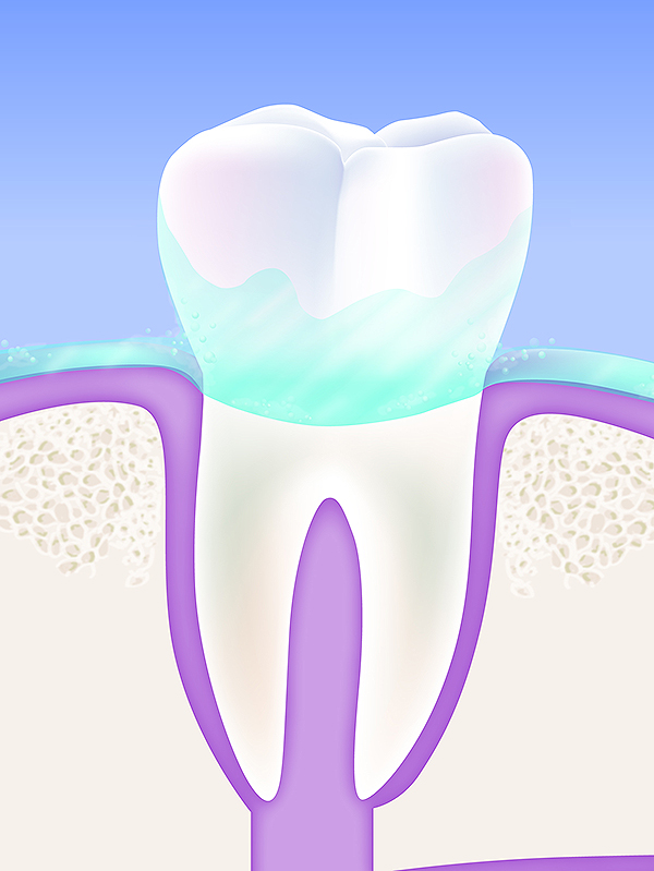 Delmopinol Hydrochloride—A recent chemotherapeutic approach for controlling plaque employs an agent that inhibits the formation of plaque while having little effect on bacteria or the balance of commensal bacteria in the oral cavity. Delmopinol hydrochloride is a surface-active agent with low antimicrobial potency.7 It interferes with biofilm matrix formation by preventing synthesis of glucan polysaccharide, the substance that keeps biofilm together and attached to oral surfaces. The adherence of primary plaque-forming bacteria is reduced, and the emerging biofilm mass is loosely adherent (Figure 1).8 The plaque can then be easily removed by the patient (Figure 2).