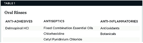 Anti-inflammatory rinses, which are newer products in the oral rinse category, attempt to break this pathologic cycle. They are marketed under two major classifications of ingredients: antioxidants and botanicals (essential oils). There is some overlap, but they are discussed separately for clarity.