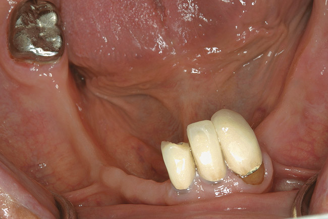 A patient with Stage 1 demineralization (Figure 2) presents with exposed root surfaces that appear dull when dried and illuminated. When palpated with the side of the explorer, the root surface feels rough and slightly soft to pressure from the side of the explorer. Color changes associated with D1 root-surface lesions may range from no color change to a darkening of the yellow color of the cementum. There is no cavitation of the root surface, and these patients may be unaware of the gingival recession occurring in their mouth. Although some patients may not present with specific concerns related to gingival recession, many patients present with sensitivity to cold and a negative perception of esthetics in the recession areas. The recommended treatment for D1 root-surface lesions includes remineralization with products (pastes and varnishes) containing fluoride, calcium, and phosphate. It is the experience of the authors that remineralization of root surfaces is often coupled with a marked decrease in sensitivity. In addition, it is critical for the clinician to determine the cause of the gingival recession to prevent the worsening of the condition.