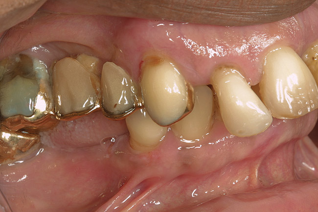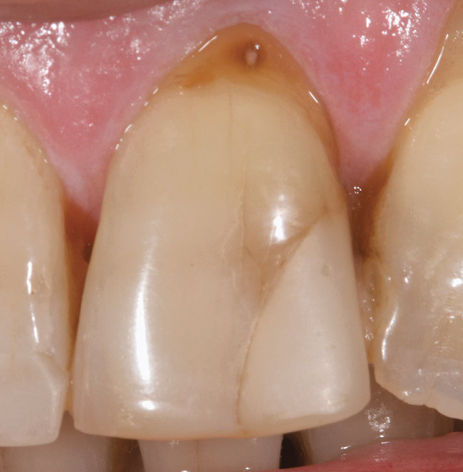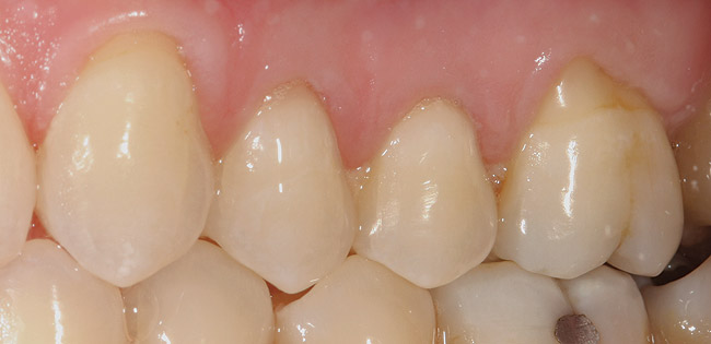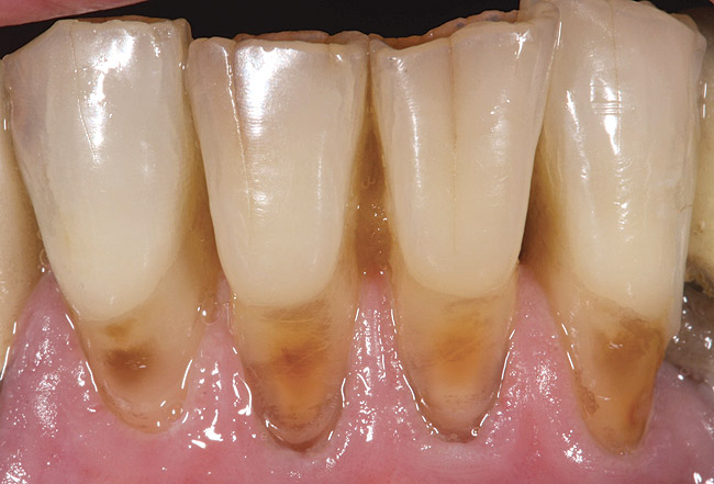 A patient with no change in root-surface quality (Figure 1) will present with gingival recession that exposes the root surfaces and no change due to disease is noted. Clinically, the root surfaces are firm, smooth, and velvety upon exploration. No color changes are noted.