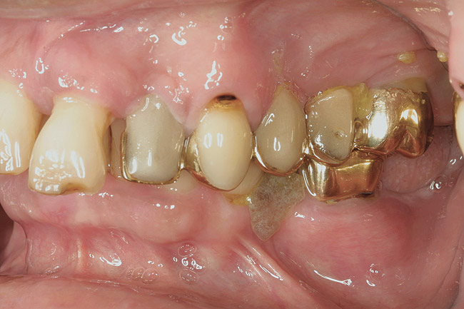 Most practitioners are currently taught to diagnose a D3 root-surface lesion (Figure 4) as active caries. The root surface is soft, sticky, cavitated, and may have debris that is easily removed with gentle palpation with the side of the explorer. Color changes may range from yellow orange/light brown to dark brown/black. The recommended treatment for D3 root-surface lesions includes remineralization of the root surface with products (pastes and varnishes) containing fluoride, calcium, and phosphate and subsequent restoration of the lost root-surface structure.