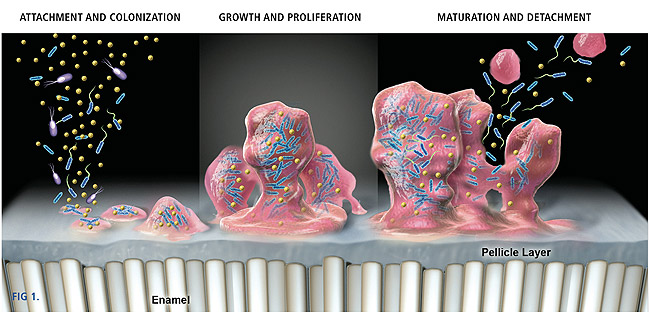 Long-term effects of treatment for periodontal disease patients reveal that success depends on maintaining plaque levels that are consistent with gingival health.19 Soon after dental prophylaxis, bacteria start to recolonize the tooth surface and plaque build-up begins again. Bacteria diffuse from mucosal and tooth surfaces into saliva and colonize other areas of the mouth. Unstimulated saliva contains 50 million to 100 million bacteria per milliliter,20,21 so the oral surfaces are constantly immersed in a reservoir of microorganisms.22