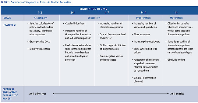 Gingivitis occurs when supragingival plaque reaches quantitative and qualitative levels of bacterial complexity that compromise gingival health. Although the microbiology of gingivitis is not yet fully understood, the sequencing of plaque formation indicates how interventions may prevent the development of gingivitis. Opportunities exist at any of these critical stages: bacterial attachment, bacterial succession and proliferation, and maturation to disrupt and inhibit the plaque mass. Although mechanical oral hygiene addresses all of these stages, the use of chemical agents enables more objective targeting.
