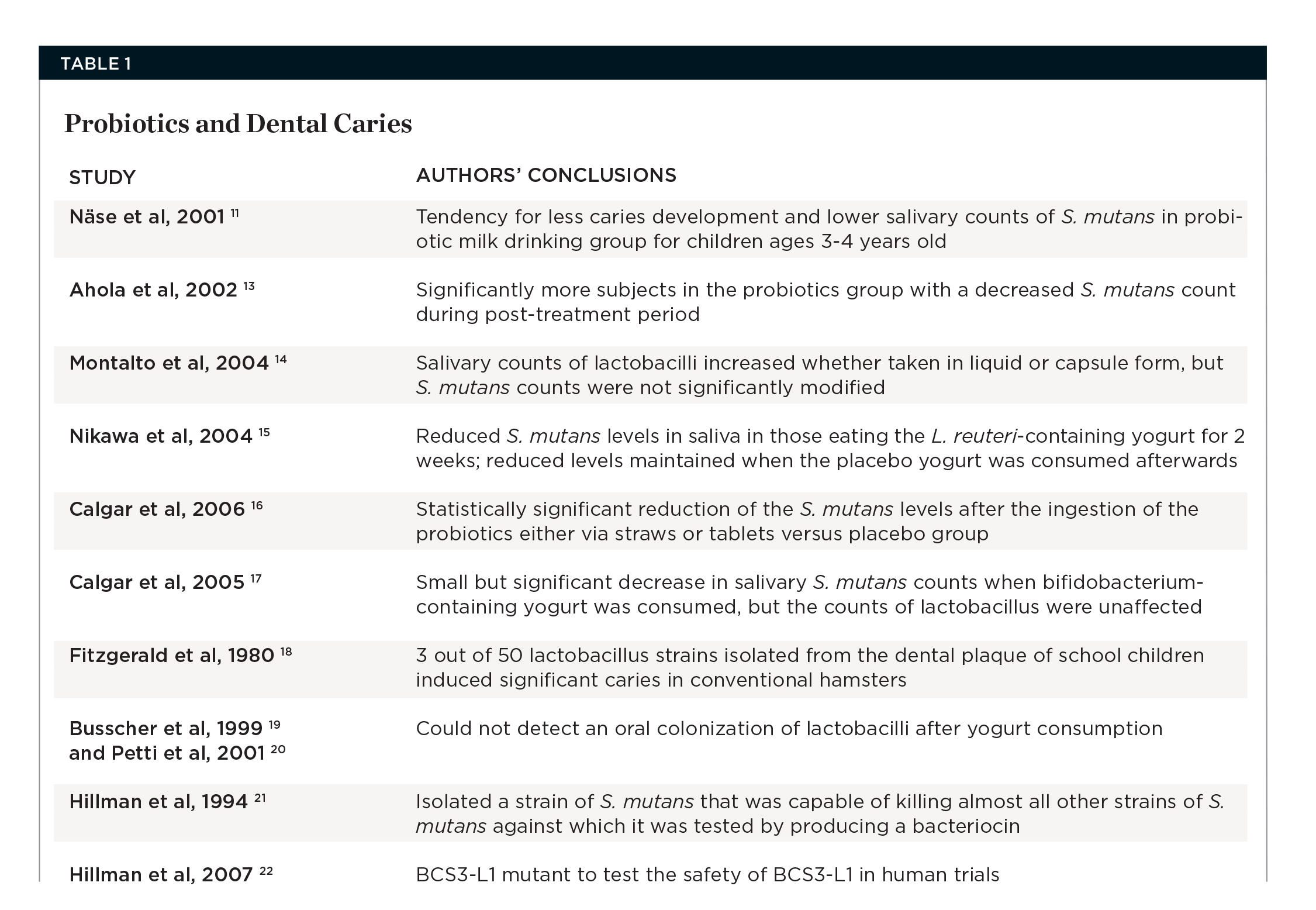 16. Calgar E, Cildir SK, Ergeneli S, et al. Salivary mutans streptococci and lactobacilli levels after ingestion of the probiotic bacterium Lactobacillus reuteri ATCC 55730 by straws or tablets. Acta Odontol Scand. 2006;64(5):314-318.