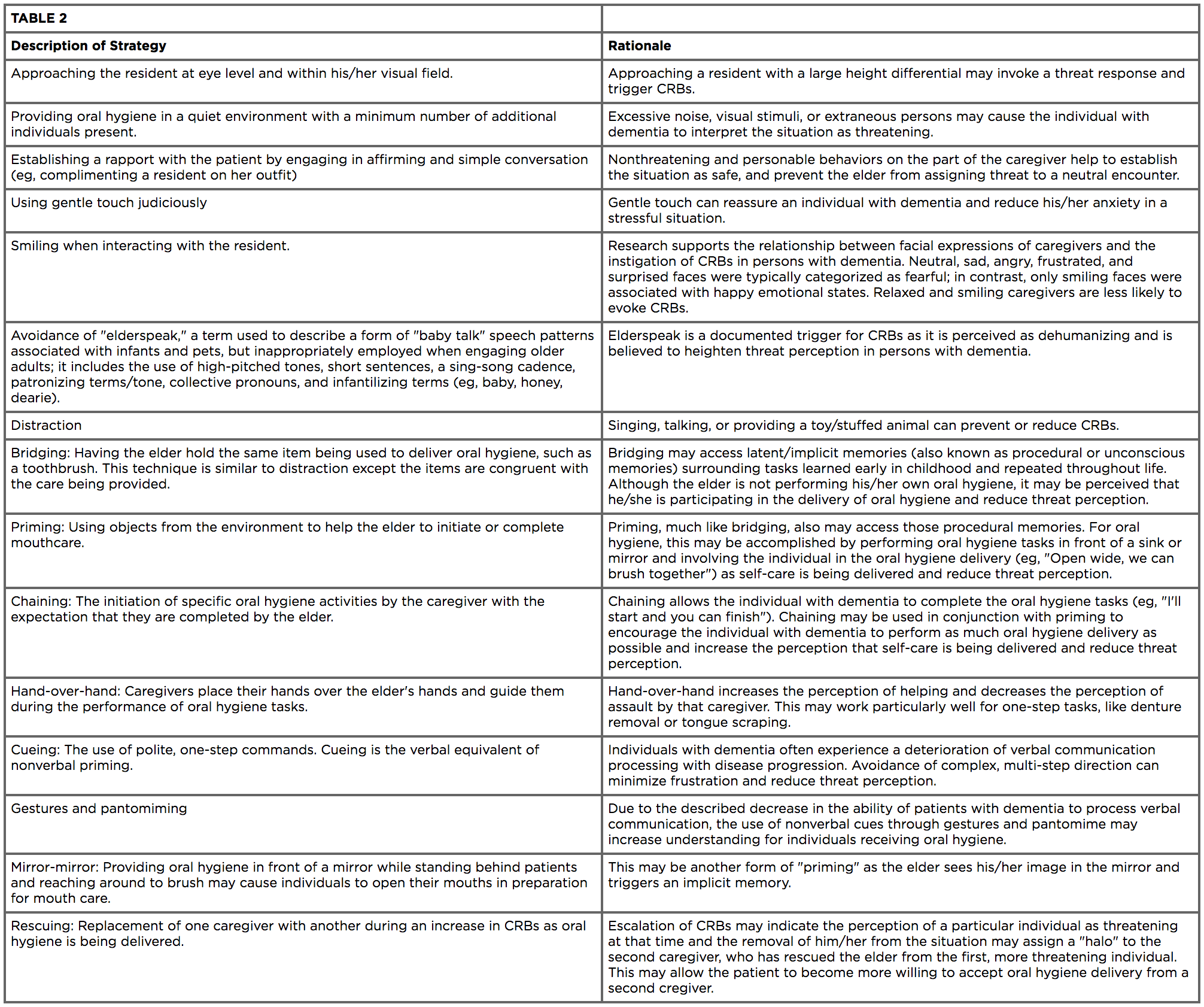 Education of nurses, nursing assistants, and caretakers is critical to ensure the success of proper oral care in patients with dementia.43 Dental prostheses are growing increasingly diverse, including natural teeth, fixed bridges, dental implants, and removable prostheses.43,44 Natural teeth require brushing and interdental cleaning,30 whereas dentures must be removed to be cleaned.29 Dental implants also require thorough preventive care to prevent inflammation and bone loss.29 Many nurses, CNAs, and other caretakers lack training in the complex care required to maintain different dental prostheses, and assessment of oral health status by individuals without specific training can be limited.43 In addition, CRBs exhibited by patients with dementia are a major obstacle to providing effective oral care.33 Offering strategies to improve oral disease recognition, delivery of effective therapeutic interventions, and plans to maintain oral health for patients with dementia are essential components to reduce the oral and systemic risk conferred by poor oral health.45 Those primary caregivers are generally the individuals who delivery day-to-day oral care; therefore, education and communication to improve their ability to care for patients with dementia is critical.33 Strategies offered may include Managing Oral Hygiene Using Threat Reduction (MOUTh) interventions.33MOUTh intervention is a nonpharmacologic, relationship-based intervention.33 Some tactics include forming a connection by approaching the patient at or below eye level, using a friendly and calm attitude, and using brief, one-step commands.32,33 A summary of strategies to address CRBs during mouth care is provided in Table 2. Care providers may have a better chance of completing mouth-care activities if they are aware of different approaches that reduce CRBs in patients with dementia.33