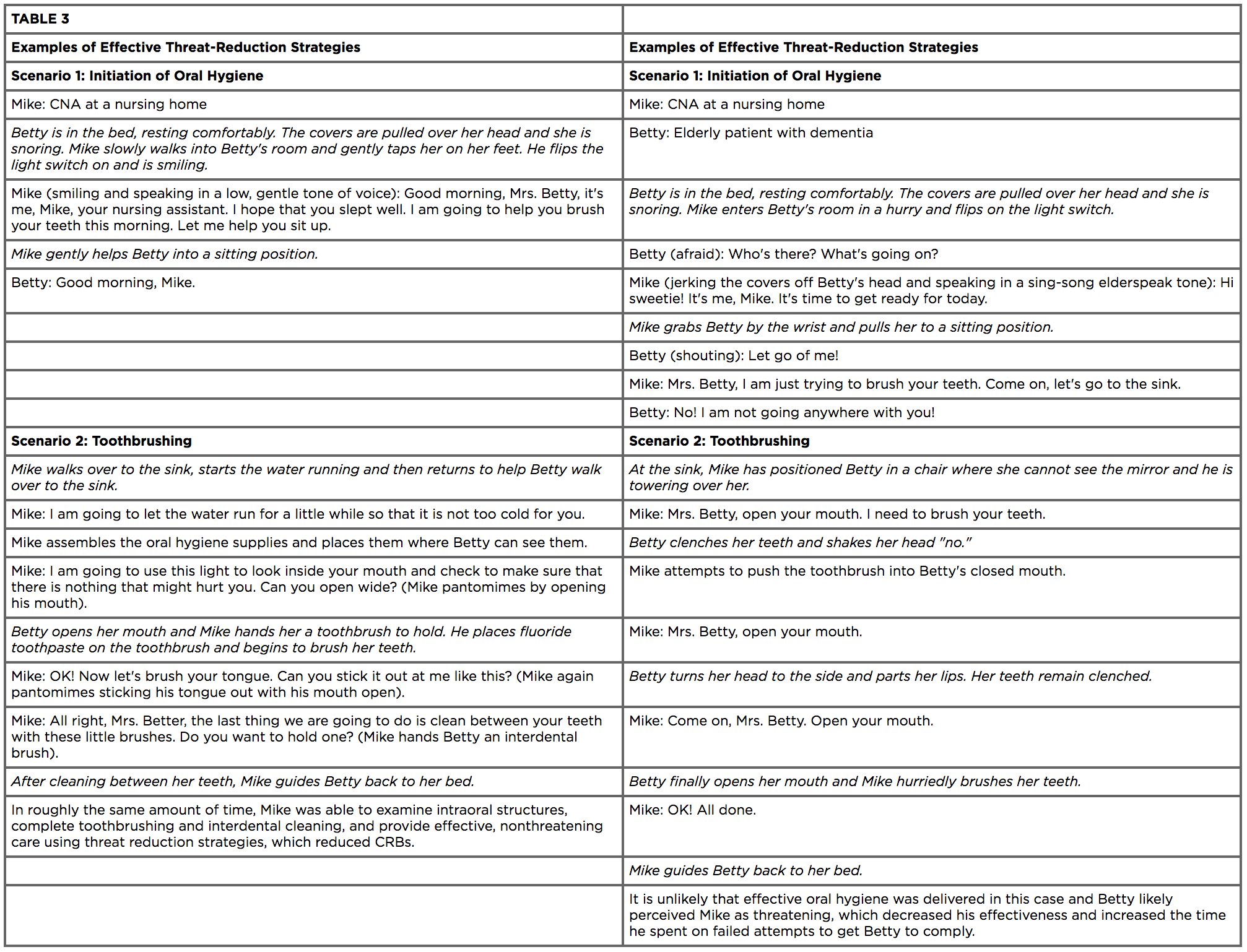 Healthcare professionals and caretakers should also consider their patient's progression and stage of dementia. The different stages of dementia can affect how a patient will cope with dental treatments and interventions.43 Healthcare professionals and caretakers must be aware that strategies that are effective in one patient may not be effective for others.43 Furthermore, a strategy that may be effective for a patient one day may not work the next week for that same patient.43 Healthcare professionals and caretakers should recognize that treatment plans may need to change over time as the patient's disease state changes.43 Some examples of effective and ineffective methods to deliver routine oral hygiene to patients are outlined in Table 3, but these may not work for all patients.