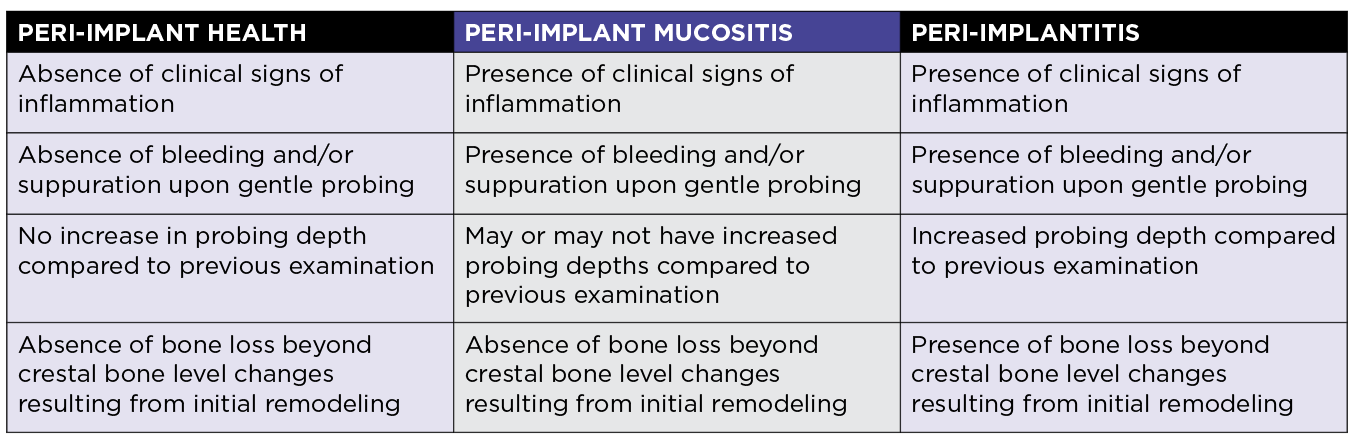 While implant survival, defined as an implant present and in function regardless of attachment loss, is a critical component of patient satisfaction with implant therapies, it does not assess ongoing inflammatory conditions, prosthetic stability, and/or esthetic concerns regarding implant therapies.3,4 As patients become more savvy about dental implants, their expectations for esthetic, phonetic, and functional success continue to increase. While many criteria, including Albrektsson, have been used to identify success rates for dental implants, new standards continue to evolve.3 More recently, the 2017 American Academy of Periodontology (AAP)/European Federation of Periodontology (EFP) World Workshop on the Classification of Periodontal and Peri-Implant Diseases and Conditions (WWDC 2017) defined criteria for peri-implant health, peri-implant mucositis, and peri-implantitis.5 Peri-implant health has been characterized as the absence of inflammation and bone loss around the implant site.5,6 This includes no signs of erythema, bleeding upon gentle probing, nor swelling and suppuration.5,6 While it is not possible to determine peri-implant health from probing depth measurements alone, due to implant anatomy and dimensions of peri-implant mucosa, it is still necessary to record probing depths and attachment levels to monitor long term health, as increasing probing depth over time has been associated with peri-implant diseases.7,8 Peri-implant mucositis is characterized by the clinical signs of inflammation absent in health.5,9 Bleeding upon gentle probing is necessary to constitute peri-implant mucositis, while erythema, swelling, and suppuration may also be present.5,9 In peri-implant mucositis, increased probing depth can be seen due to mucosal swelling and a decreased resistance by connective tissue prior to onset of bone loss.5,9 These inflammatory signs are initiated by plaque accumulation in the peri-implant tissues, but the histologic lesion that develops, the inflammatory markers present, and the time to resolution of clinical and histologic inflammation were greater at sites with experimental peri-implant mucositis than those with experimental gingivitis.10 Peri-implantitis has been characterized as a plaque-induced pathological condition with inflammatory signs in the mucosa and progressive loss of supporting bone structure.5,11 Inflammatory signs noted are similar to those of peri-implant mucositis, including bleeding and/or suppuration upon gentle probing, erythema, and swelling.5,11 The presence of bone loss beyond the crestal bone level changes of initial remodeling results in increased probing depths over time and radiographic bone loss..5,11 Figure 1 illustrates the details of similarities and differences in each classification.