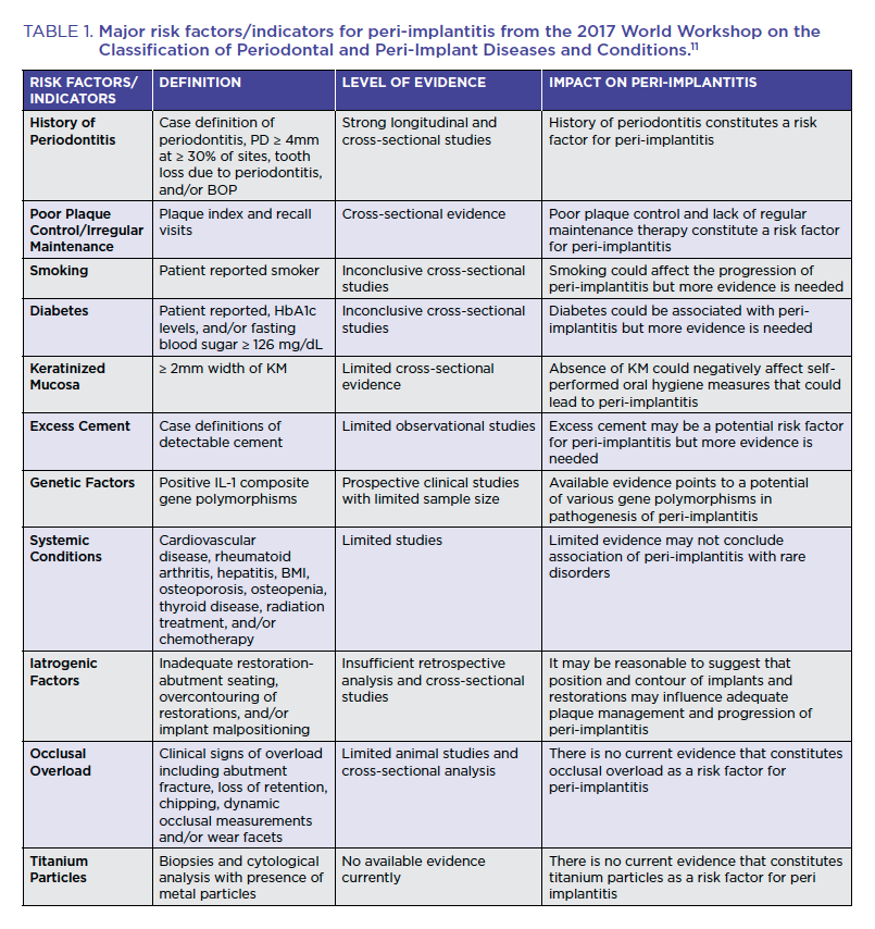 In clinical practice, successful dental implant therapy allows practitioners to help patients achieve optimal oral health and esthetic outcomes, which rely heavily upon many patient, site, and treatment-related factors. Factors related to patients' systemic health, patient behaviors, site-specific anatomy, restoration type, and fixture type have all been indicated in the development of peri-implant diseases and worsening treatment outcomes after therapy.5 Proper patient selection and pre-procedural planning to reduce or eliminate these risk factors may reduce the overall need for peri-implant disease treatment.