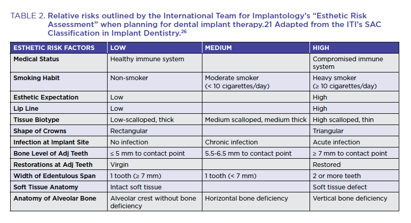Esthetic success is also important in meeting patient expectations and achieving high levels of satisfaction. Both local and systemic factors can negatively impact esthetic success. Table 2 (online at aegisdentalnetwork.com/go/idh521) illustrates the main areas of esthetic concern and how they influence overall risk as outlined by the International Team for Implantology's "Esthetic Risk Assessment."21 Complete assessment of local factors and patient expectations is critical to overall patient-assessed success. Intraoral and extraoral photography and videography can help capture lip positioning and mobility, while intraoral impressions can allow for assessment of site-specific dimensions and periodontal phenotype. A deep understanding of the patient's expectations, however, requires thorough conversations and may include the use of digital image manipulation to demonstrate a realistic outcome.