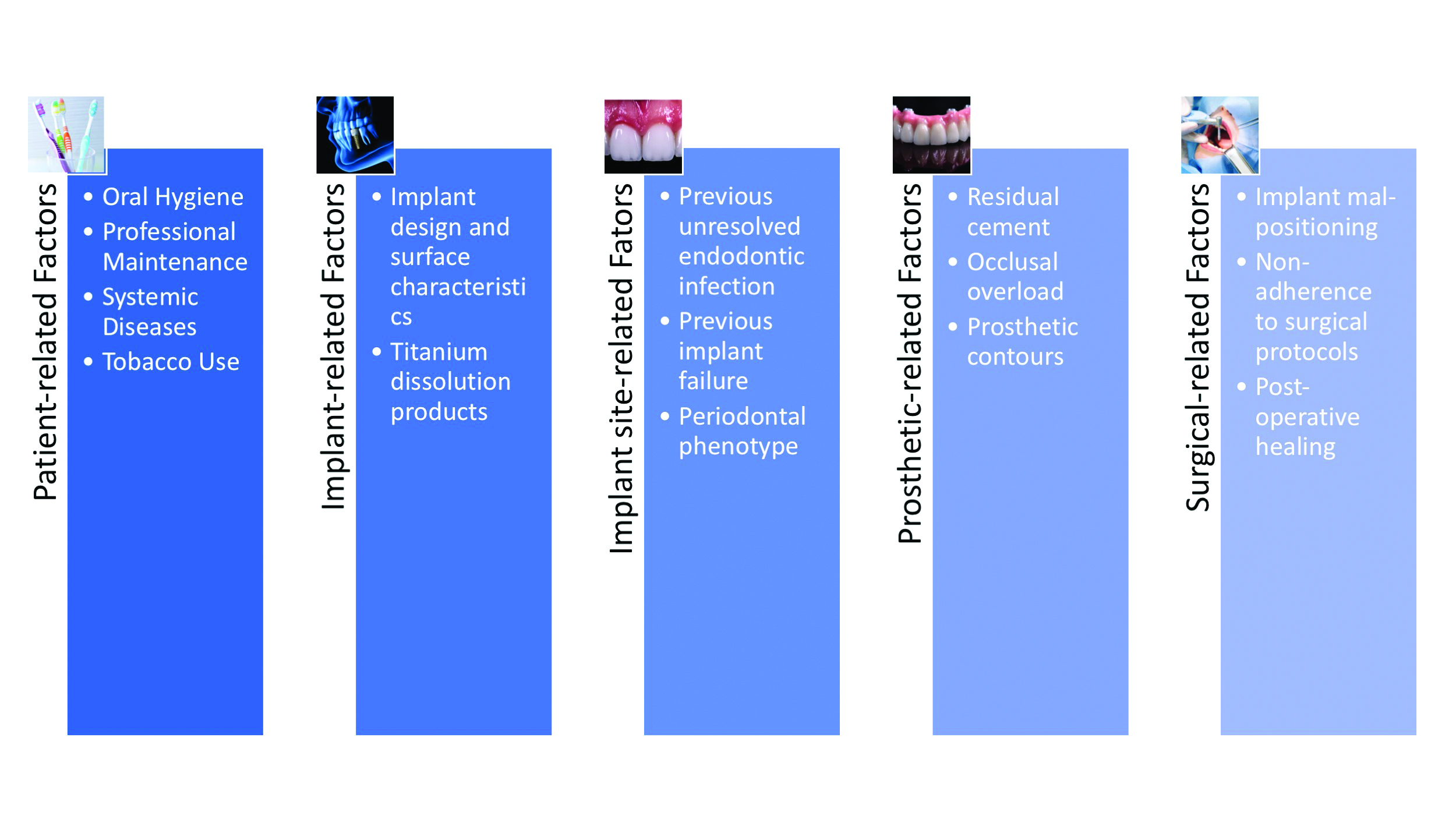 It is estimated that between 2 million and 3 million dental implants are placed and restored each year in the United States.1,2 Dental implants are reported to have a high mean cumulative survival rate of 96.1% post-loading, but survival is generally defined as the implants being present and in function and does not consider overall implant health or disease.3 Rates of peri-implant mucositis and peri-implantitis have been noted to be approximately 43% and 22%, respectively, with the prevalence of peri-implant disease increasing with implant function time.4 Given the volume of implants placed and the prevalence of peri-implant diseases, it is critical that dental healthcare professionals are able to make evidence-based treatment recommendations that can reduce the patient's risk for developing peri-implant diseases. This article reviews common risk factors for peri-implant diseases and recommendations for dental implant care that can prevent development of such diseases.