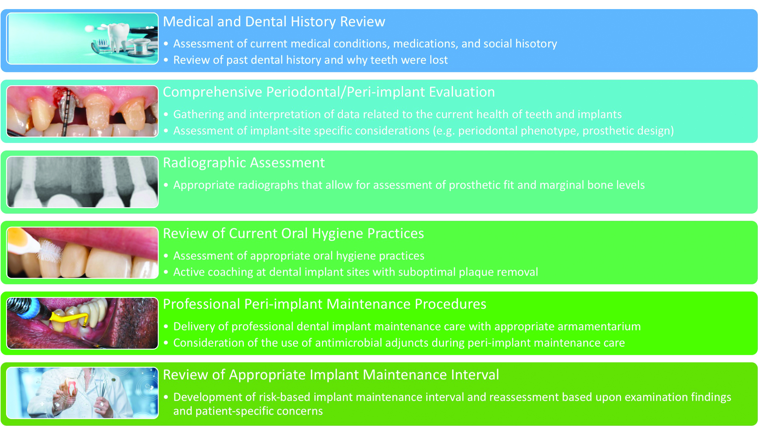 Given the high number of dental implants placed annually and an increasing focus on long-term success rates for dental implants, the prevention of peri-implant diseases has come to the forefront. Dental implant placement and restoration requires an interdisciplinary approach, and a similar focus on the multifactorial risks for development of peri-implant diseases should be employed as a part of ongoing implant maintenance to achieve optimal implant health. Dental healthcare professionals should develop risk-based maintenance protocols for dental implant patients and emphasize regular examinations, professional dental hygiene care, and effective home care to promote long-term success.28,62,63 It has been noted that increases in training and familiarity with implant protocols is associated with an increased emphasis on preventive oral hygiene protocols during implant maintenance by dental healthcare professionals.64 These findings highlight the importance of continuing education on best practices for implant maintenance. Furthermore, a consensus statement from the 11th European Workshop on Periodontology confirmed the importance of both home care and professional dental hygiene care in the maintenance of peri-implant health.65