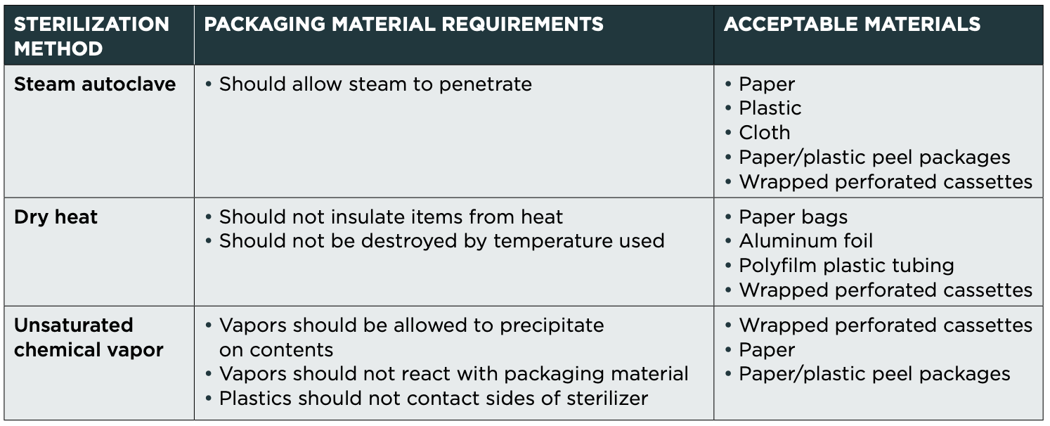 Once instruments are cleaned, they move to the packaging zone which provides sterility for the patient care devices throughout the sterilization process. The packaging materials must be FDA-approved and, according to the CDC, "should be designed for the type of sterilization process being used and … appropriate for the items being sterilized"7 (Figure 2). To determine the packaging materials, the CDC provides specific recommendations for sterilization methods, package material requirements, and use of acceptable materials (Table 1).7